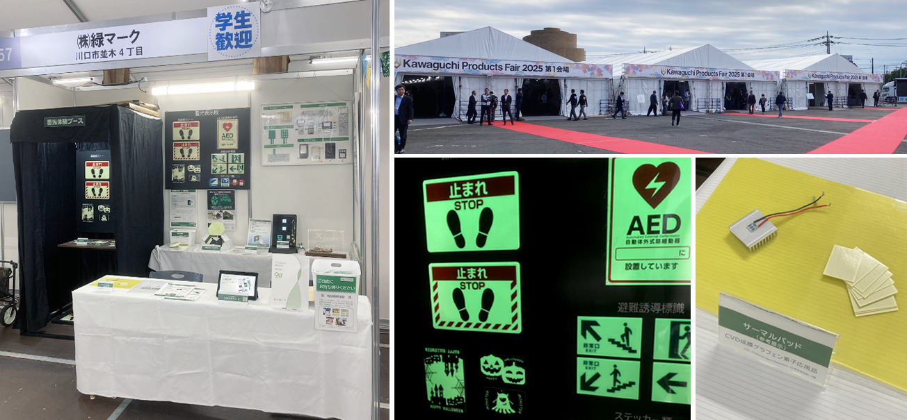 今年は蓄光を使った路面標示シートや標識、テープなどの製品や、グラフェンを用いて3D放熱を可能とした「サーマルパッド」をご紹介いたしました。蓄光体験ブースでは、暗闇の中で明るく光る蓄光に多くの方々にご覧いただきました。