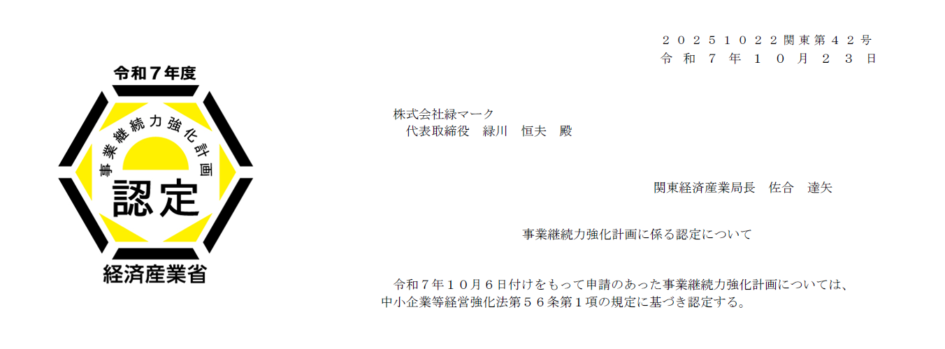 令和7年10月6日付 関東経済産業局より事業継続力強化計画に係る認定を受けました。事業継続力強化計画認定制度とは、中小企業が策定した防災・減災の事前対策に関する計画を経済産業大臣が「事業継続力強化計画」として認定する制度です。今後起こりうる自然災害に備え、お客様への影響を最小限にとどめるとともに、従業員の安全を確保し事業継続のできる体制で取り組んでまいります。