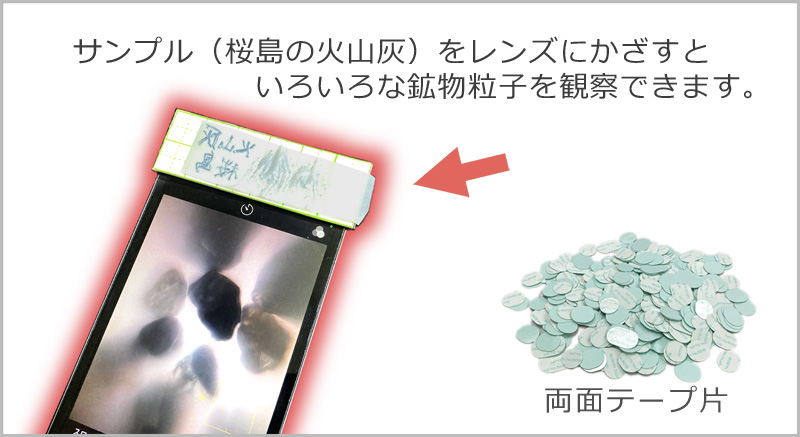 日本各地の火山灰を観察するというワークショップにおいて、スマートフォンやタブレットのカメラ部分に貼り付けるために、テープを活用したとのことです。